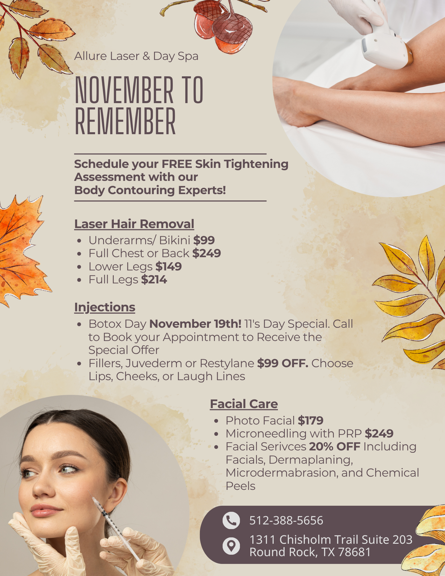 At Allure Laser & Day Spa, you are in the exclusive company of professionals dedicated to a single purpose—your enhancement. Your little imperfections can now quickly and safely become a distant memory. Using safe, precise laser light, our specially trained staff will restore the natural beauty you were born with. You will emerge from Allure Laser & Day Spa in a whole new light.